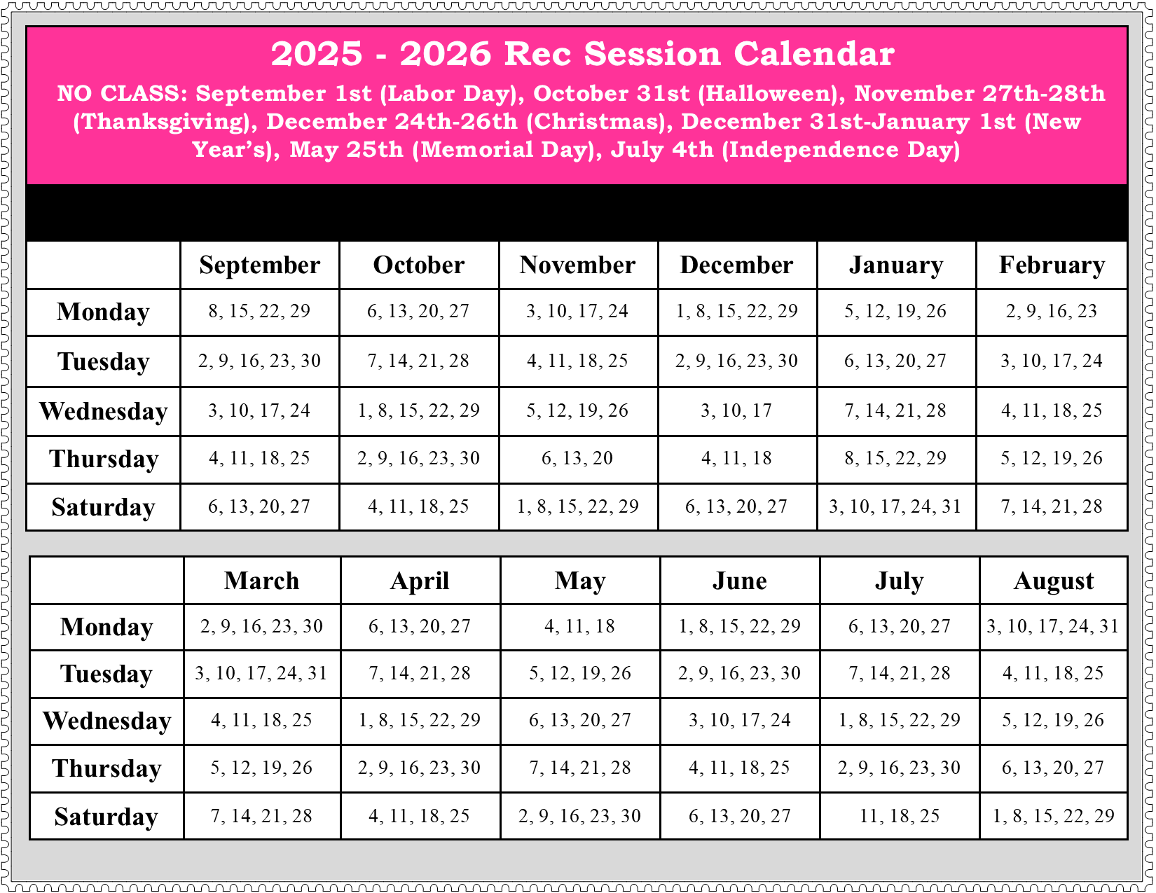 Recreational Class Calendar